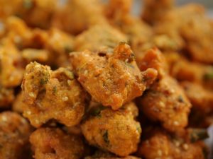 -Bowl mein chicken,pink salt,lal mirch crushed,sabut dhania,zeera,ajwain,lal mich powder,garam masala powder,lemon juice,zarda ka rang,baking soda,baisan,chawal ka atta,til,hara pyaz aur hara dhania dal dein.