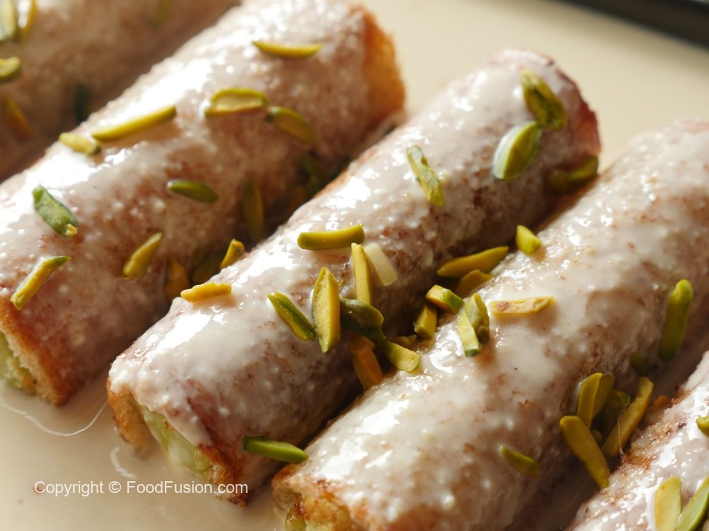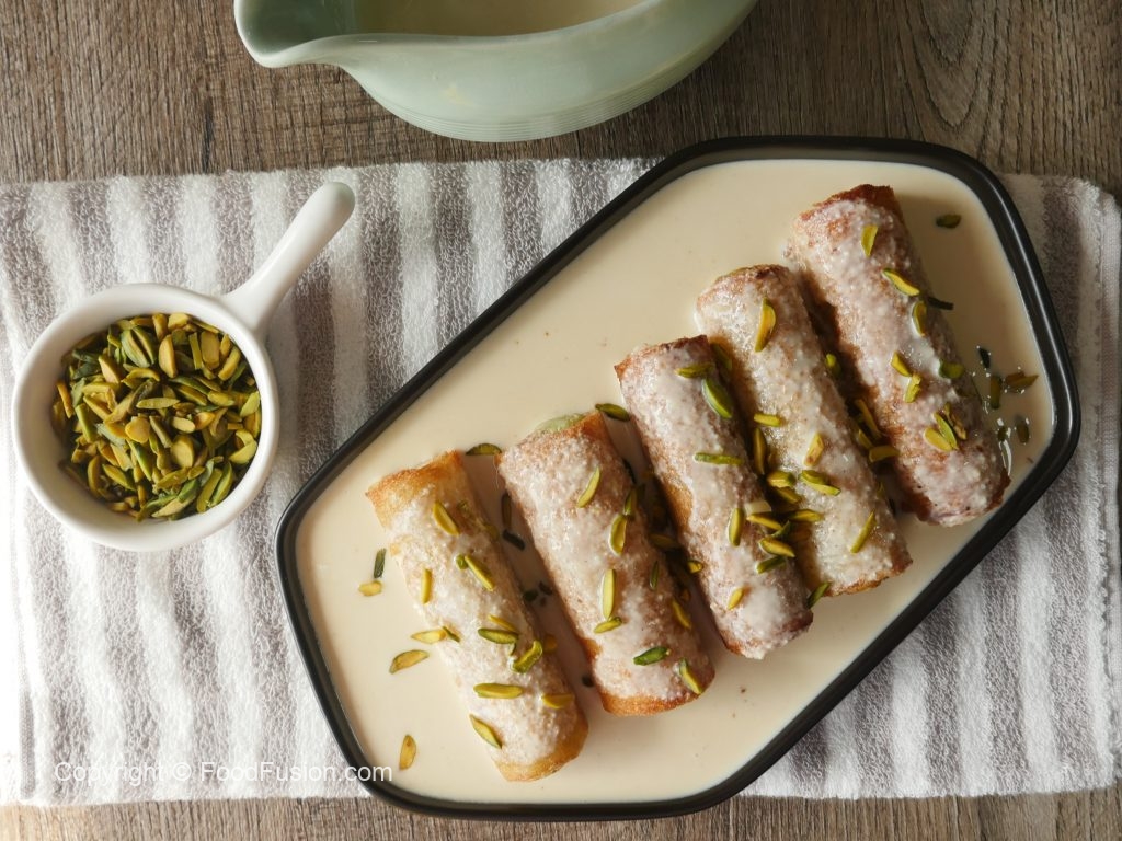 Serving dish mein bread rolls ups rakh dein aur neem garam doodh dal dein.