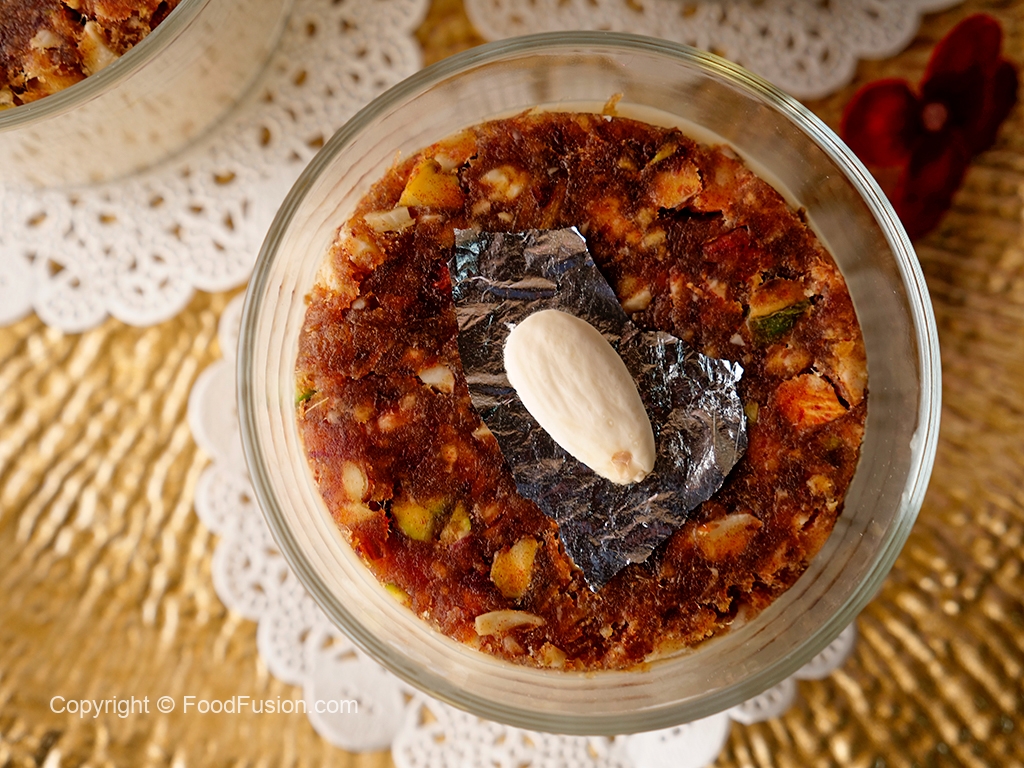 Serving glass mein tayyar sheer khurma dal ker upper sa date mousse disc rakh dein.