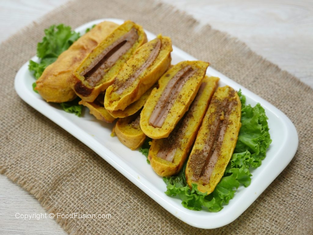 Cut lotus root from the center into two halves and take potato mixture and coat properly on lotus roots & set aside.