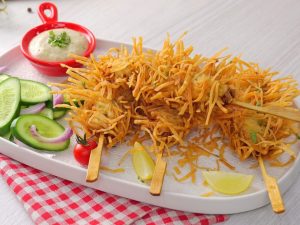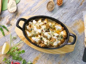 Garam sizzler pan mein chicken boti,dahi aur flavored butter dal ker serve karein!
