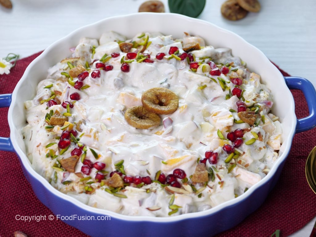 -Papaya,banana,cheeku,melon,apple,pista,badam aur injeer dal ker ache tarhan mix ker lein.
