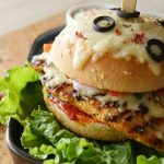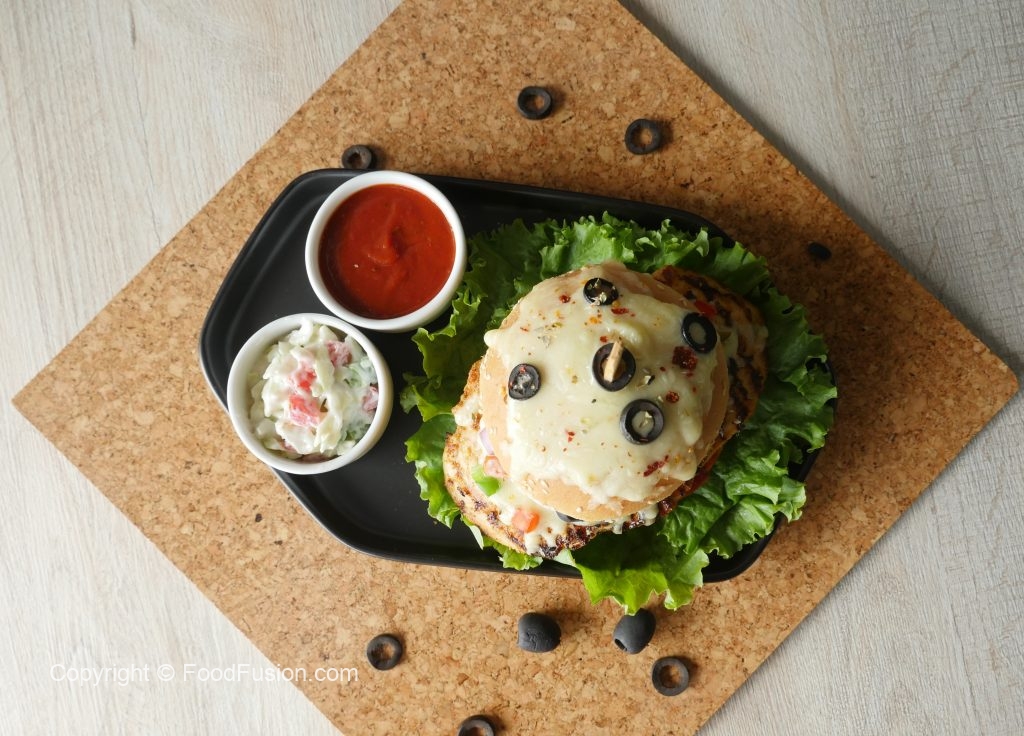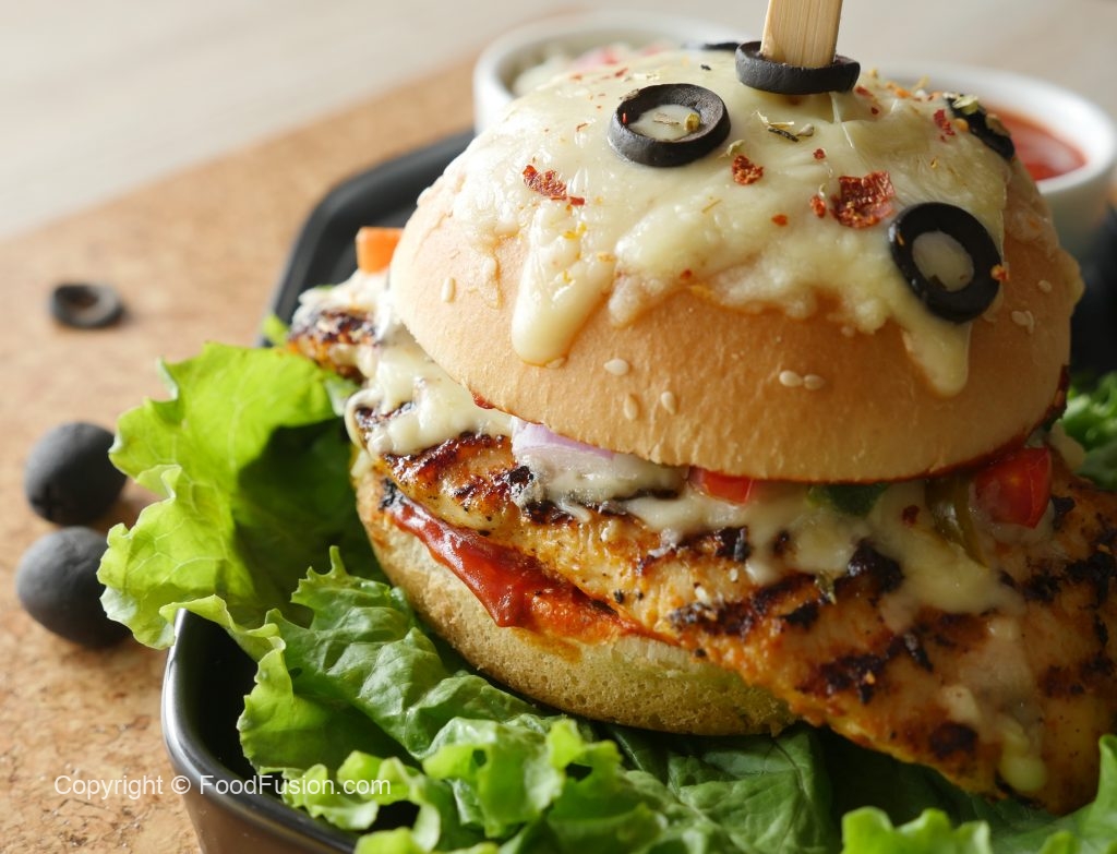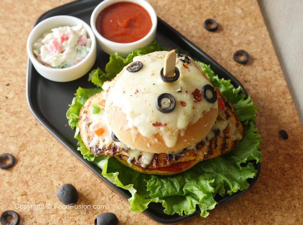 On burger bun,add & spread pizza sauce,place cooked chicken fillet,cheddar cheese,mozzarella cheese, onion,capsicum,tomato,jalapenos,black olives,dried oregano and red chili crushed.