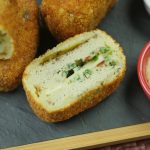 Now dip into beaten eggs and coat with breadcrumbs then again dip into beaten eggs and coat with breadcrumbs (makes 6).