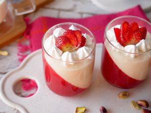 In serving glass,add prepared pistachio kheer enough to cover strawberry jelly and garnish with whipped cream & strawberry slices.