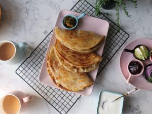 -Grease hand with ghee and press gently with both hands to spread the dough to make a paratha.