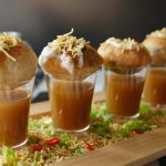 Poke gol gappa from the center,add chickpeas,potato & whole green gram,spicy green chutney,yogurt, prepared meethi chutney,sprinkle chaat masala,nimco sev & serve with prepared minty khatta pani!