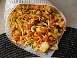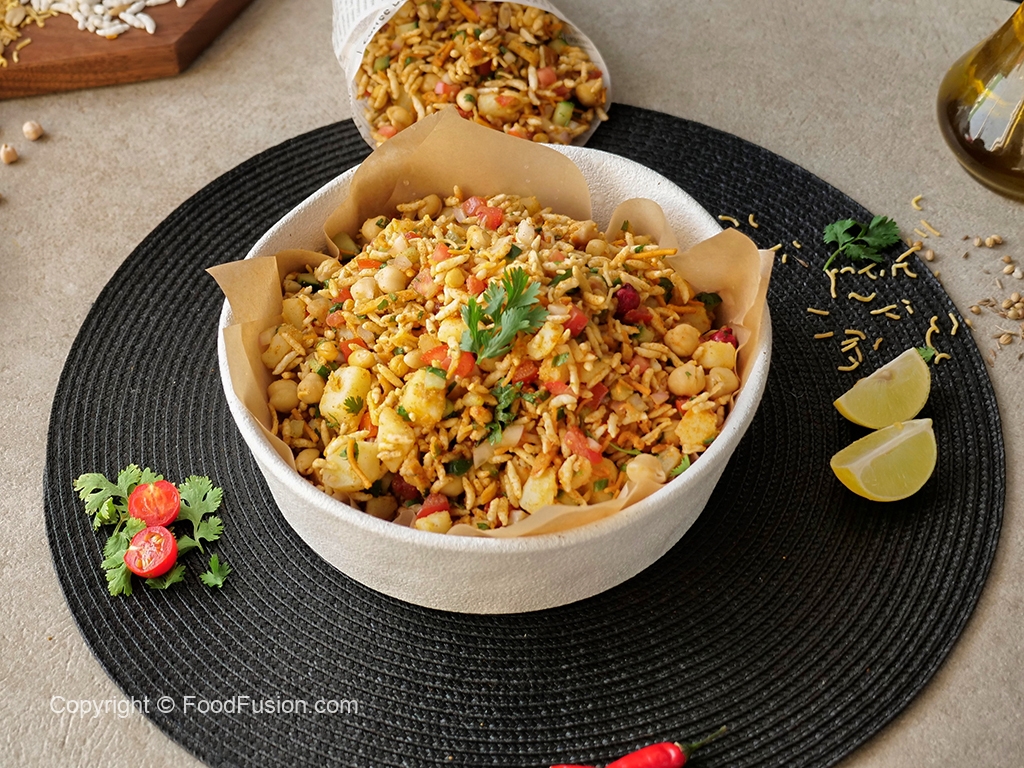 In a bowl,add roasted puffed rice,cucumber,onion,chickpeas,tomato,potato,green chilli,ginger,nimco mix,pickled oil,prepared spice mix,fresh coriander,lemon juice & mix well.