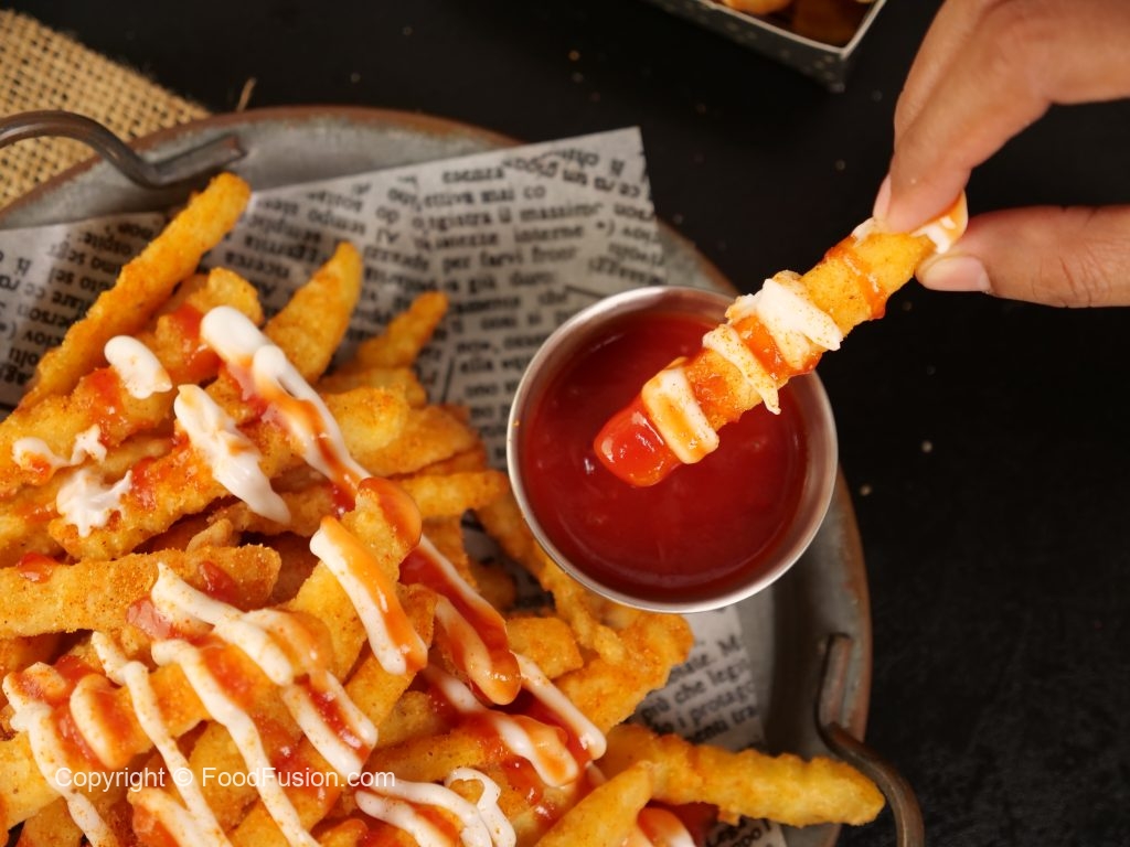 -In a wok,heat cooking oil & fry potato fries on medium low flame for 5 minutes then takeout & let it rest for 10 minutes,repeat frying process & fry on medium low flame until golden & crispy.