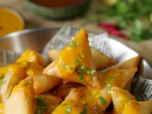 -Cut samosa sheet,make a pocket,add prepared potato filling (1 tsp) & roll into the shape of samosa and seal corners with all-purpose flour slurry & reserve remaining potato mixture for chutney.