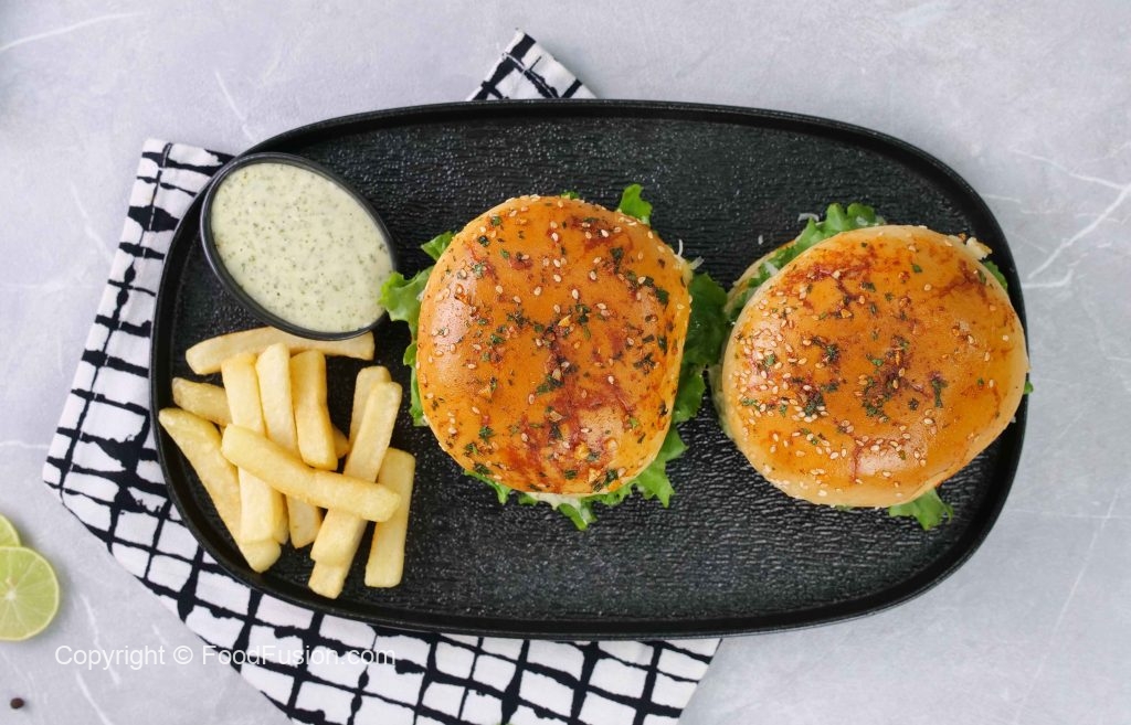 -On burger bun,add & spread prepared burger sauce,salad leaf,fried patty with cheese,tomato ketchup & cover with top bun to make a burger.