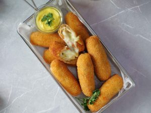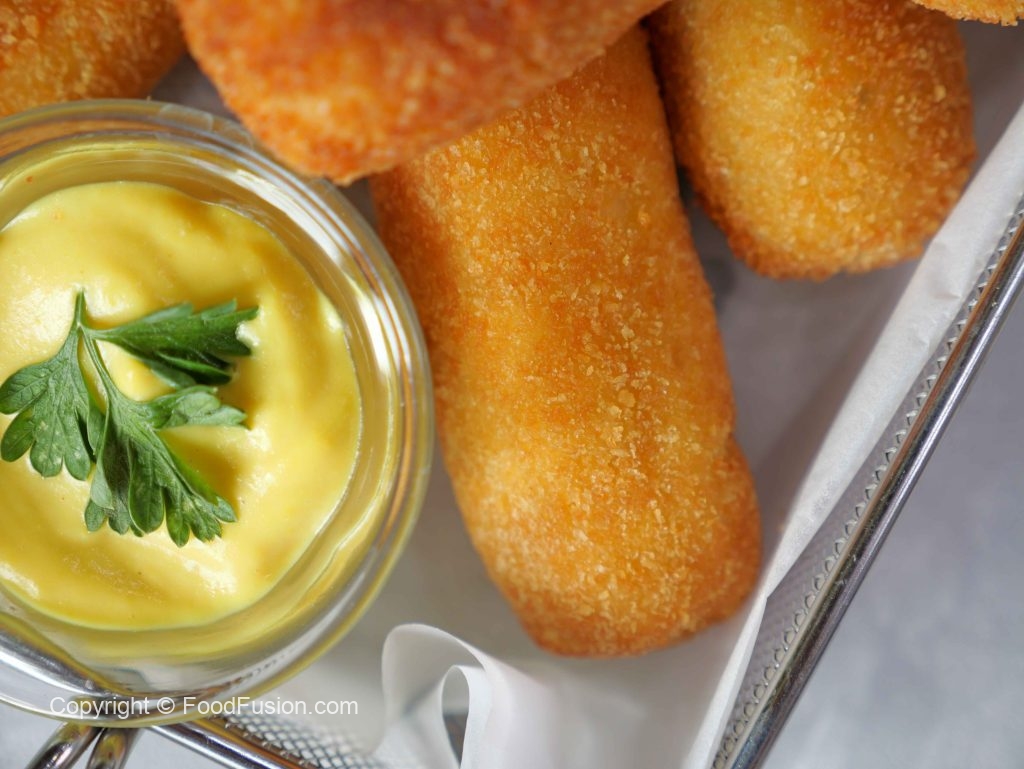 -Coat with all-purpose flour then dip into whisked eggs & coat with breadcrumbs then repeat same coating (makes 8-10 fingers).