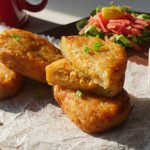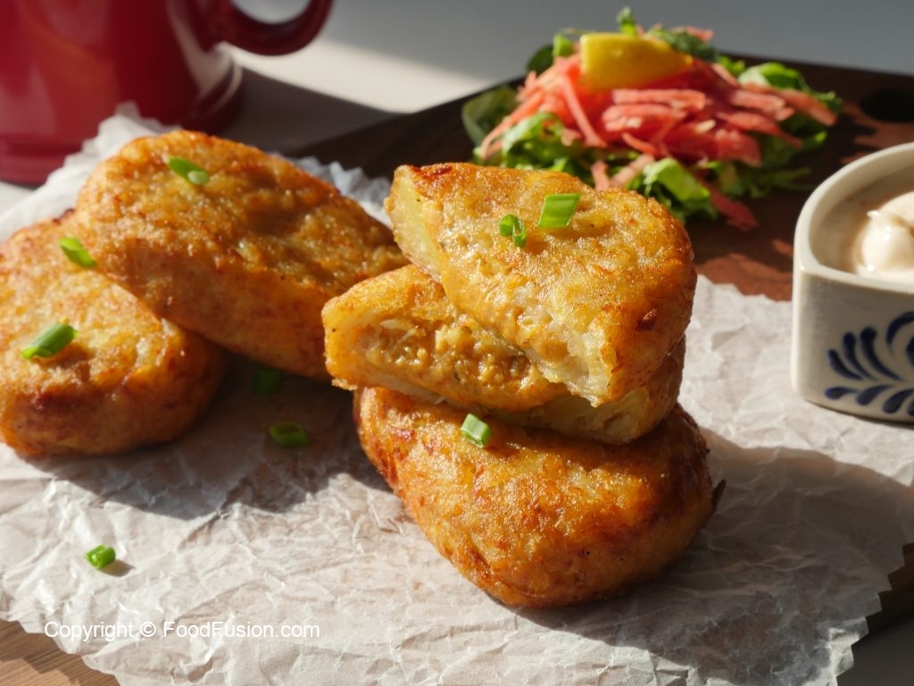 Grease hands with oil,take a potato mixture and flatten on your palm,add chicken mince mixture and cover the filling with chicken mixture to make hash brown of equal sizes (makes 14-15) and freeze for 3-4 hours before frying.