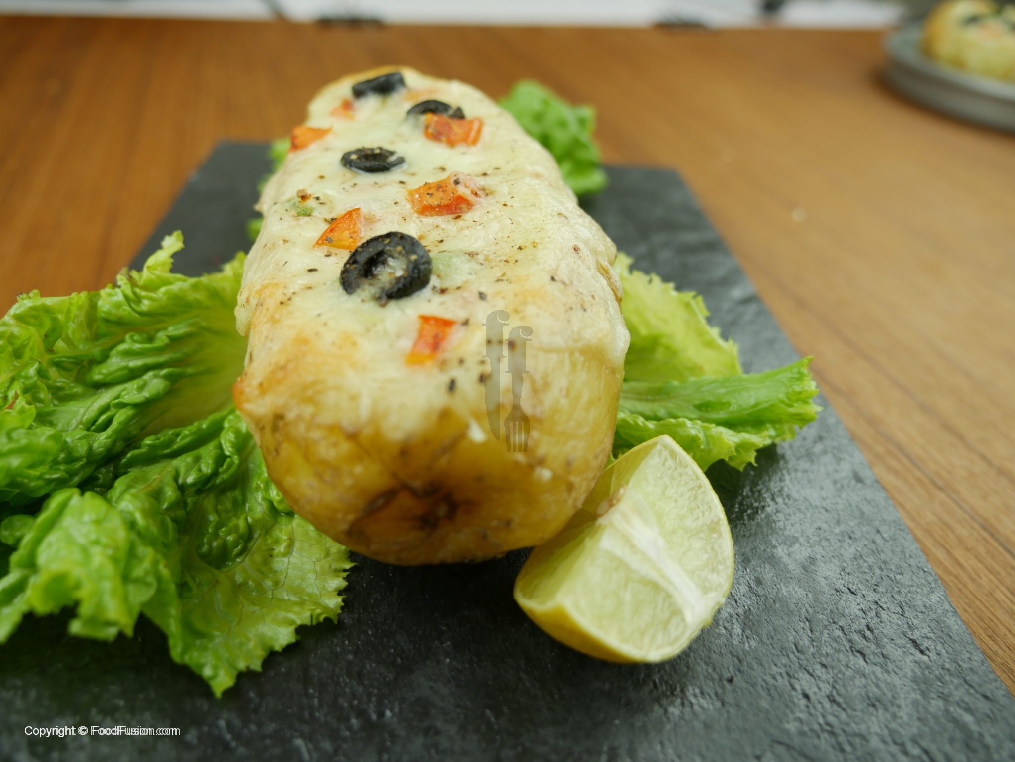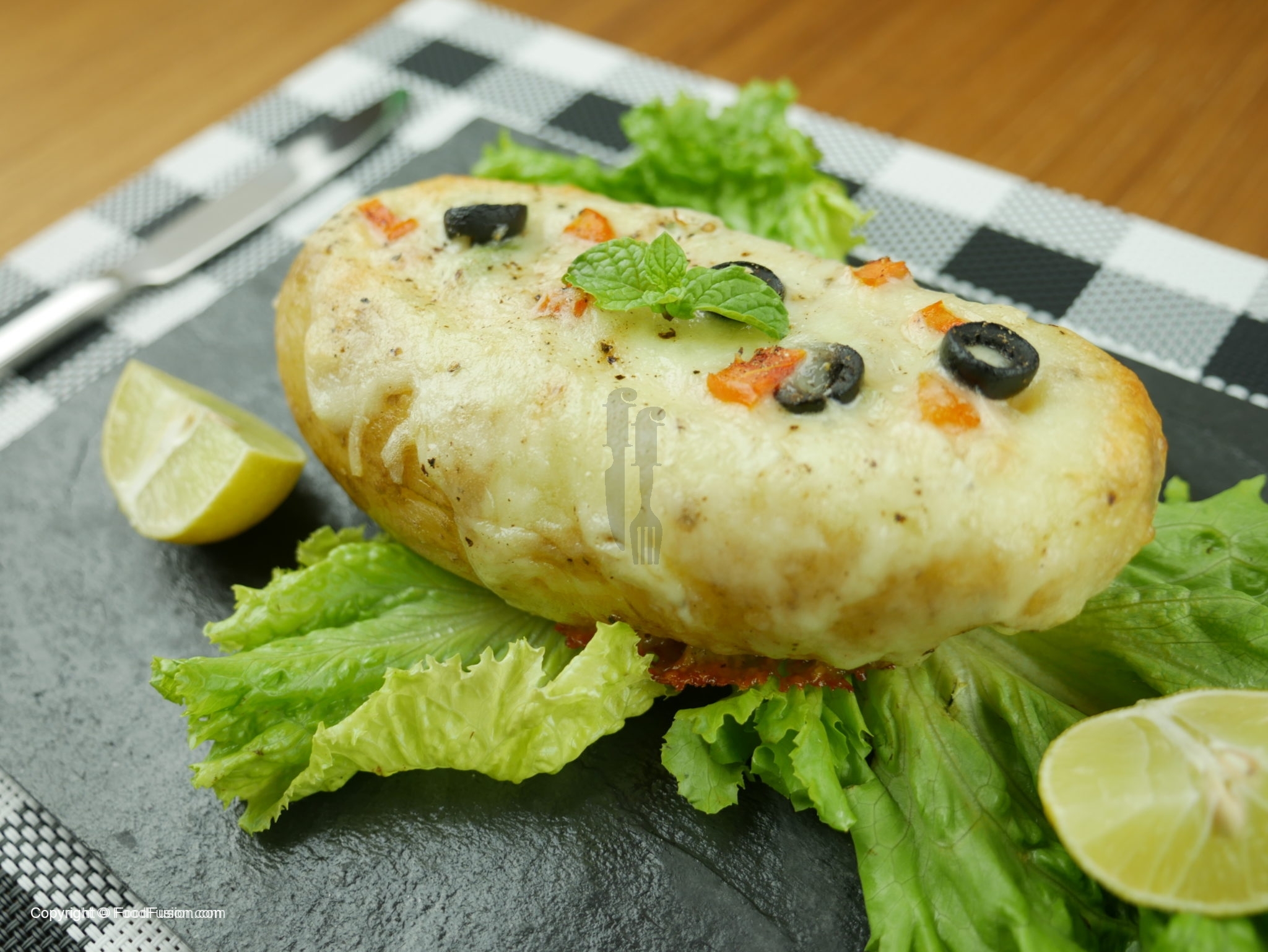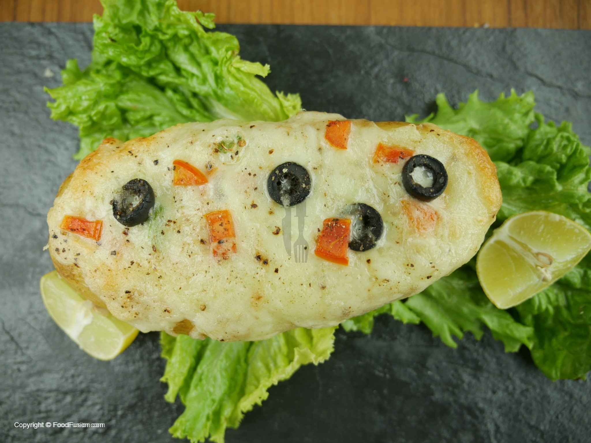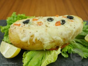 Fill potato with salt, butter, mince chicken, green onion, tomatoes. Add cheese on top, garnish with olives, black pepper and bake for 20 minutes.