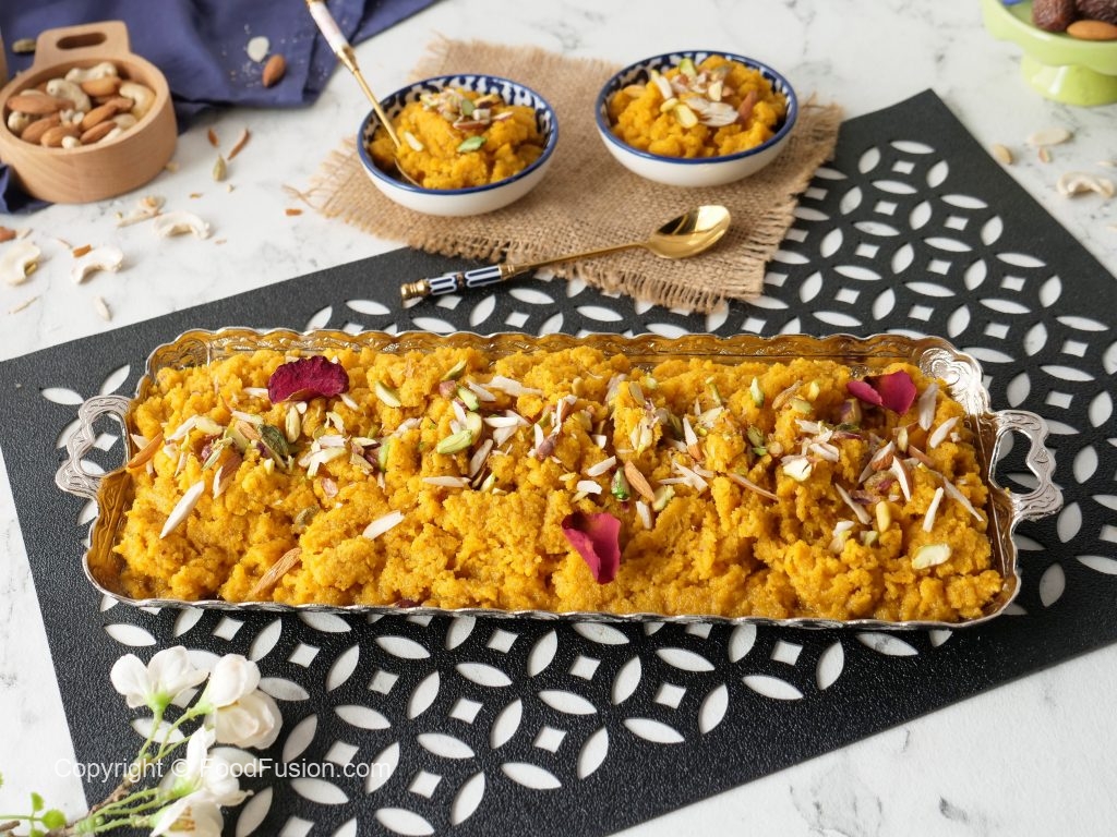 Add semolina,mix well & cook on low flame until its fragrant & changes color (10-12 minutes).