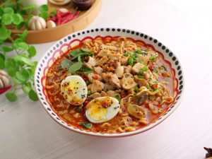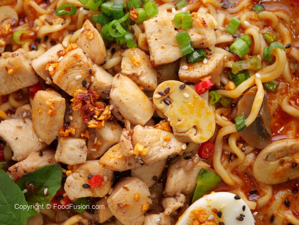 -Add cooked chicken,spring onion,thai red chilli,fresh basil leaves,boiled egg,chilli oil,sesame seeds & serve!