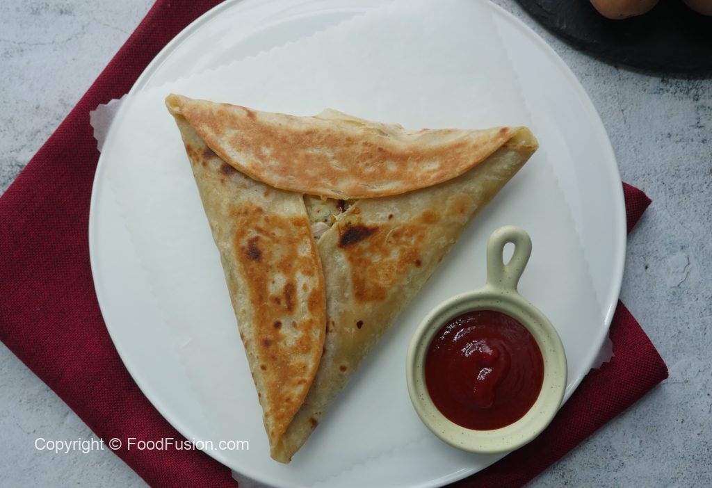Tortilla ya roti ka upper aloo& chicken filling dal ker triangle shape mein pheela lein.
