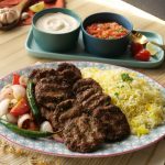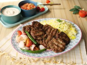 -Kofta kebab ko saffron butter rice,grilled vegetables & tahini yogurt sauce ka saath serve karein.