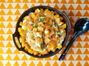 -In a jar, add gram flour, rice flour, orange food color, carom seeds, coriander, red chilli powder, pink salt, cumin, turmeric powder, red chilli crushed, baking soda, cover & shake well. Set aside.