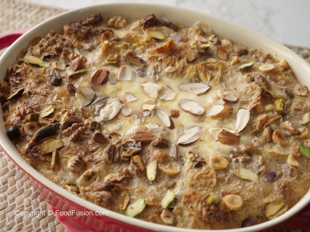 Baking dish mein puff pastry ko break ker ka dal dein,darchini powder,khopra,kishmish, hazelnuts, akhrot,pista,tayyar doodh dal dein aur upper sa cream aur badam dal dein.