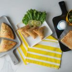 On working surface,sprinkle all-purpose flour,place plain paratha and cut into two halves.