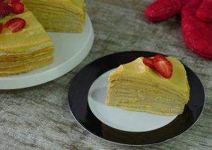 Remove from frying pan and place the crepe on a kitchen towel so that it will not stick & allow the layers to cool down completely at room temperature before stacking them (makes 15).