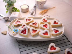 -Sprinkle icing sugar on hollow heart cookies.