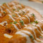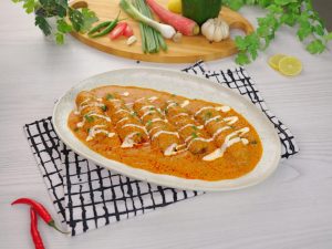 -In a serving platter add vegetable seekh kabab, pour gravy over kabab, garnish with cream & fresh coriander, serve with naan!