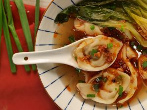 -In a bowl,add glass noodles,prepared wonton soup,bok choy,chilli oil,spring onion leaves & serve!