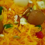 Zarda is ready, add gulab jamun and chum chum for garnishing.